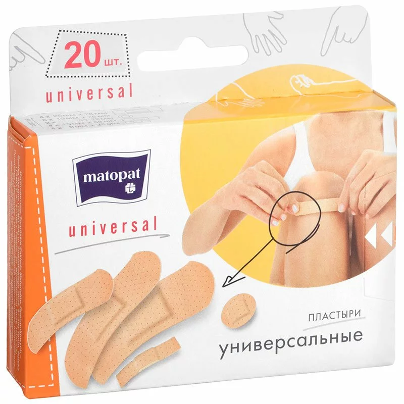 Пластирі медичні Matopat UNIVERSAL 20шт. Пластир Матопат універсал - Від порізів, незручного взуття та інших неприємностей не застрахований ніхто, тому важливо завжди носити з собою пластир. Засіб такого типу від марки Matopat завжди допоможе повернути вам відчуття комфорту. Даний пластир виконаний з нетканого матеріалу. Покриття просочене клеющими елементами, які не дратують навіть дуже чутливу шкіру. Пластир надійно кріпиться до шкіри і не відклеюється в самий незручний момент, як це часто буває. Ви можете спокійно використовувати його протягом цілого дня. Мікроотвори на його поверхні дозволяють шкірі вільно дихати, а значить сприяють загоєнню. Нейтральний тілесний колір пластиру не дуже контрастує зі шкірою. У даній упаковці знаходиться 20 пластирів різної форми. Виробник: Польща.