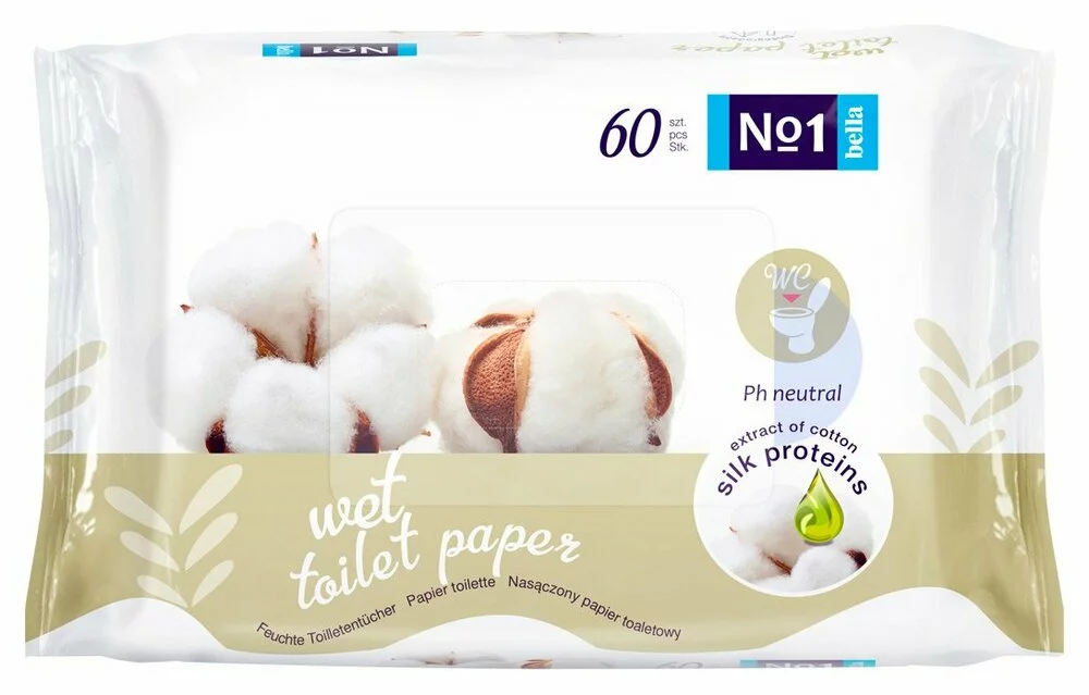 Вологий туалетний папір Белла №1 (60 ш), з протеїнами шовка. Дає відчуття чистоти та свіжості, ідеально очищає шкіру. Містить екстракт бавовни та протеїни шовка, пом'якшує, запобігає подразненню, підтримує регенерацію і відновлення епідермісу. Живить і зволожує шкіру, дає відчуття м'якості. Не містить спирт, Ph нейтральний. Можна змивати в унітаз. Підходить для щоденного використання.