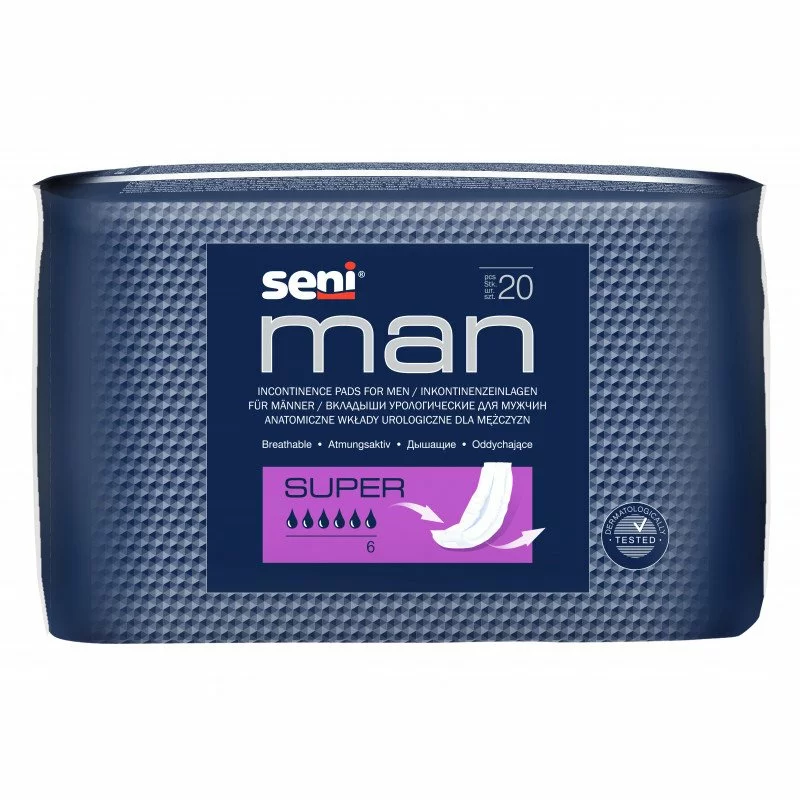 Урологічні прокладки SENI MAN SUPER 20шт в упаковці, розроблені для чоловіків, які ведуть активний спосіб життя та цінують комфорт і безпеку разом із непомітністю.